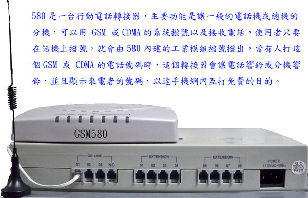580是一台行动电话转接器,主要功能是让一般的电话机或总机的分机,可以用